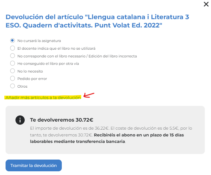 - Devolución: En el caso de querer devolver un artículo, deben escoger el motivo y les aparecerá toda la información referente a la devolución. *En una misma incidencia de devolución, se pueden añadir más artículos. Una vez indicados, hay que pulsar en tramitar la devolución.